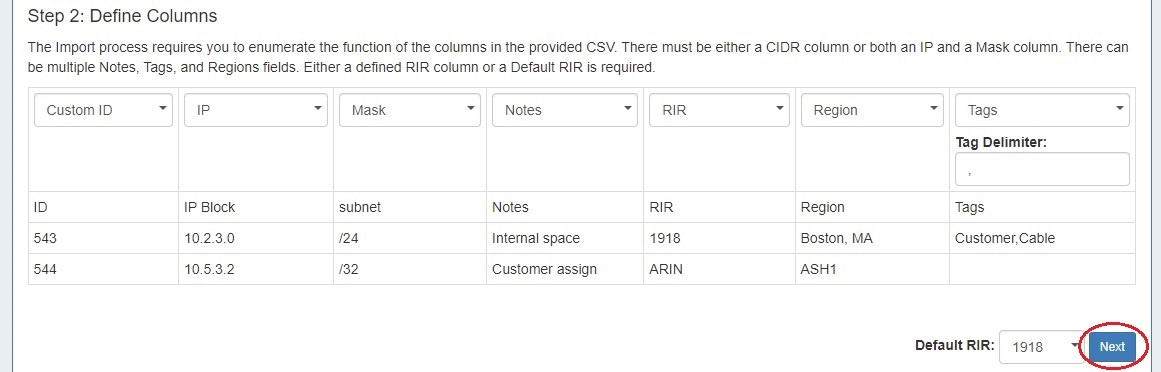 • If you do not have a defined RIR column, you must select a default RIR to associated the blocks to.