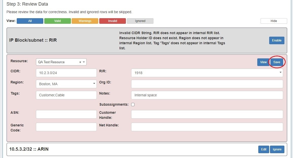 • If the IP Import was only partially successful or requires additional review, you may keep the import job in the "Existing Jobs" list and revise the failed / invalid blocks at a later time. Re-running the import from the same job will allow you to re-attempt import on only the previously unsuccessful / ignored / edited blocks - successfully imported and unchanged blocks will not be affected.