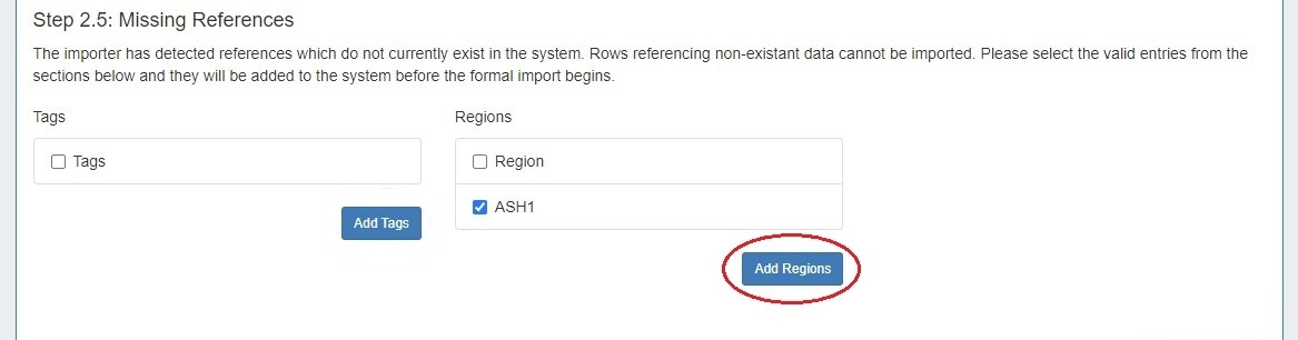 If references exist in your data that do not currently exist in ProVision (such as new tags or resources) the import tool will alert you to the missing references, and give you the option to create those references in ProVision. If you wish to add these elements, select the checkboxes next to the element and click the "Add (Element name)" button below.