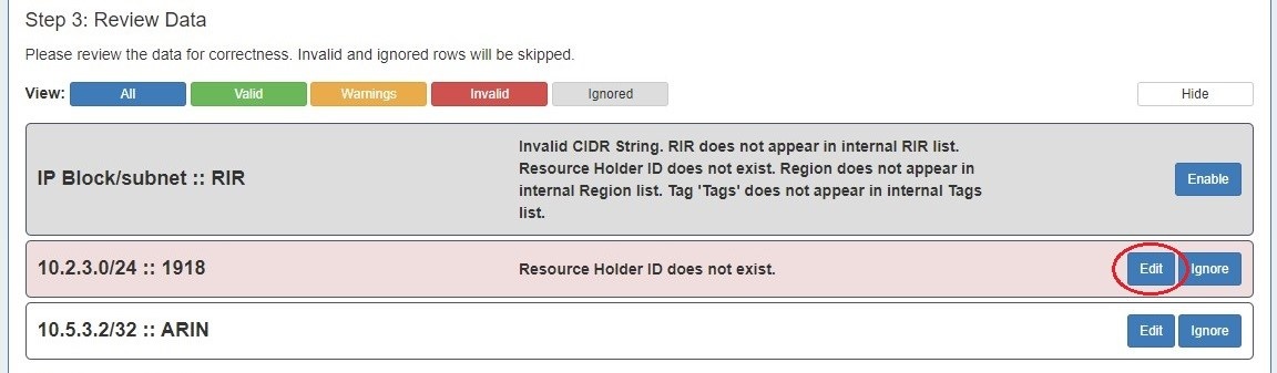 If warnings or invalid entries are found, you may edit the data by clicking the "Edit" button.