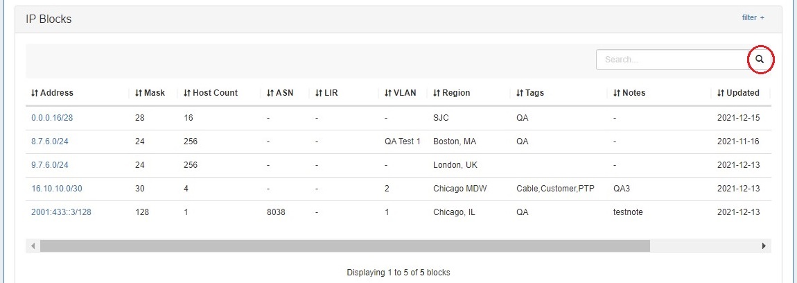View, search, filter, and sort Assigned Blocks for the resource via the "IP Blocks" list: