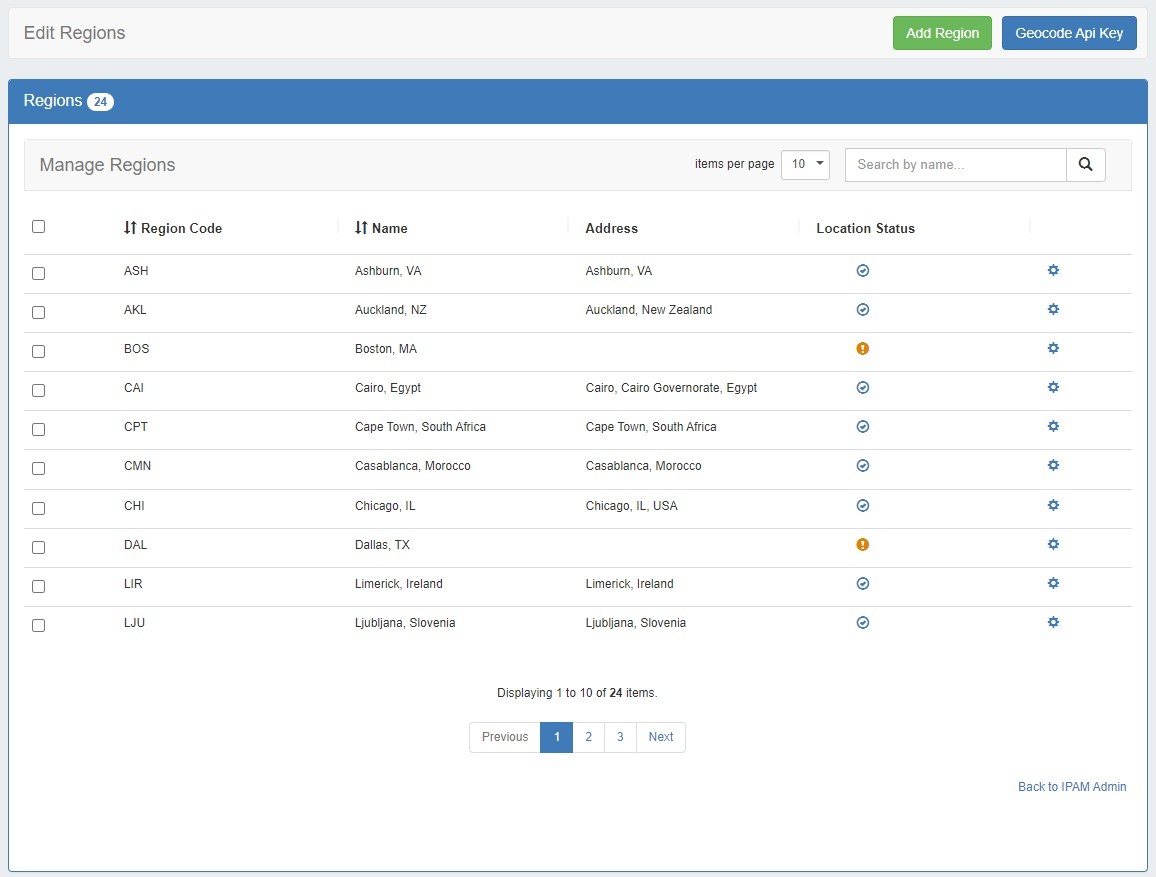 - The 'Address' field is used by IPAM map view (via Geocode API) to geolocate aggregates with that assigned region. Address may be in the form of a City / State / Country, a full street address, a company name, or other search term that the Geocode API can return a location for. The more accurate your address information, the more accurate map view will be with your aggregate locations. To use regions, you will need to apply a Geocode API Key. An "address" value that appears invalid will display a yellow warning symbol.