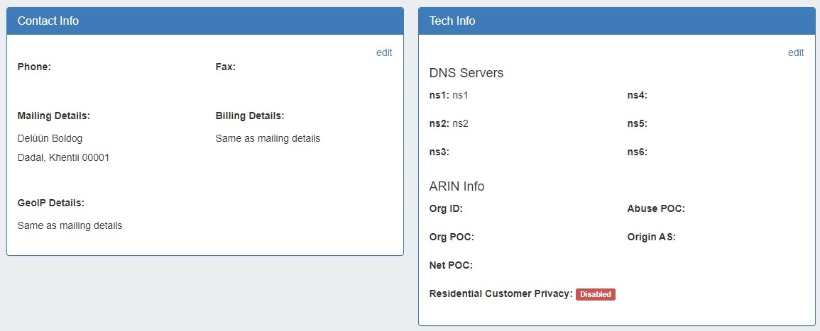 The story of this block is therefore: "ARIN was given this IP Block by ICANN, then ARIN did a Direct Allocation of a /20 to EXPCO." And in a bit here, ProVision will do a detailed re-assign to MedaTeckle, a made-up company whose headquarters is the birthplace of Genghis Khan.