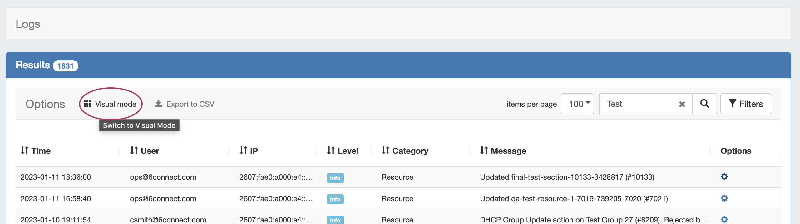 To view the graphical chart version of Logs, click the "Visual Mode" toggle at the top of the results list.