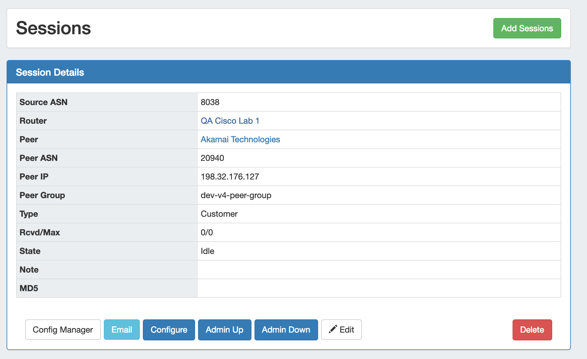 From here, new session may be created by clicking "Add Sessions" if desired, but it is primarily for session management. You may also click on the Router link to view the Router Details page, or the Peer Name for Peer Details.