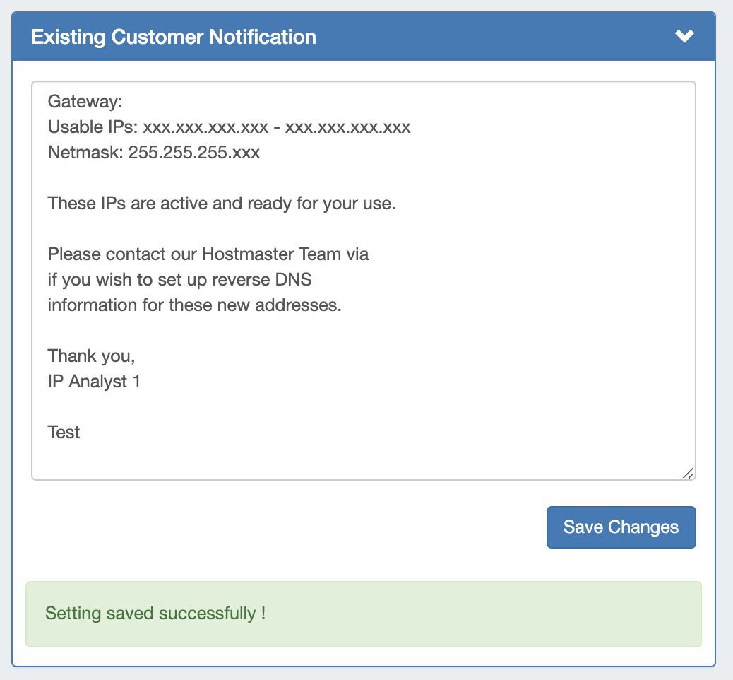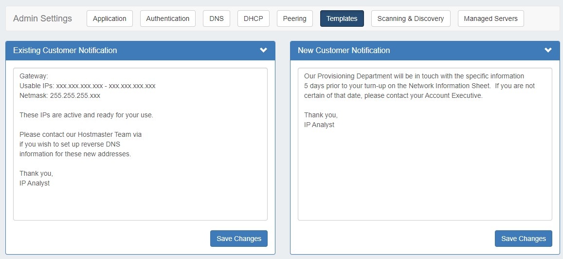Email Templates are accessed by clicking the "Templates" sub-tab at the top of the Admin Settings page, and is where you can edit outgoing email templates for IP block assignments.