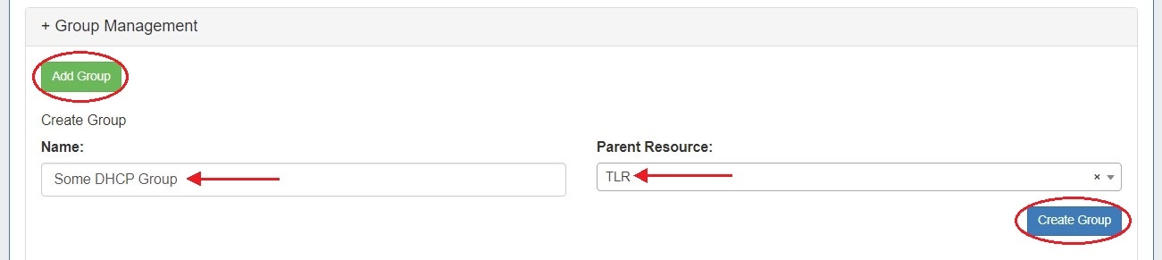 A "Default Group" should be available immediately, or you can click the "Add Group" button to create a new DHCP group. Type in the desired group name and select a parent resource for the group, then click "Create Group".