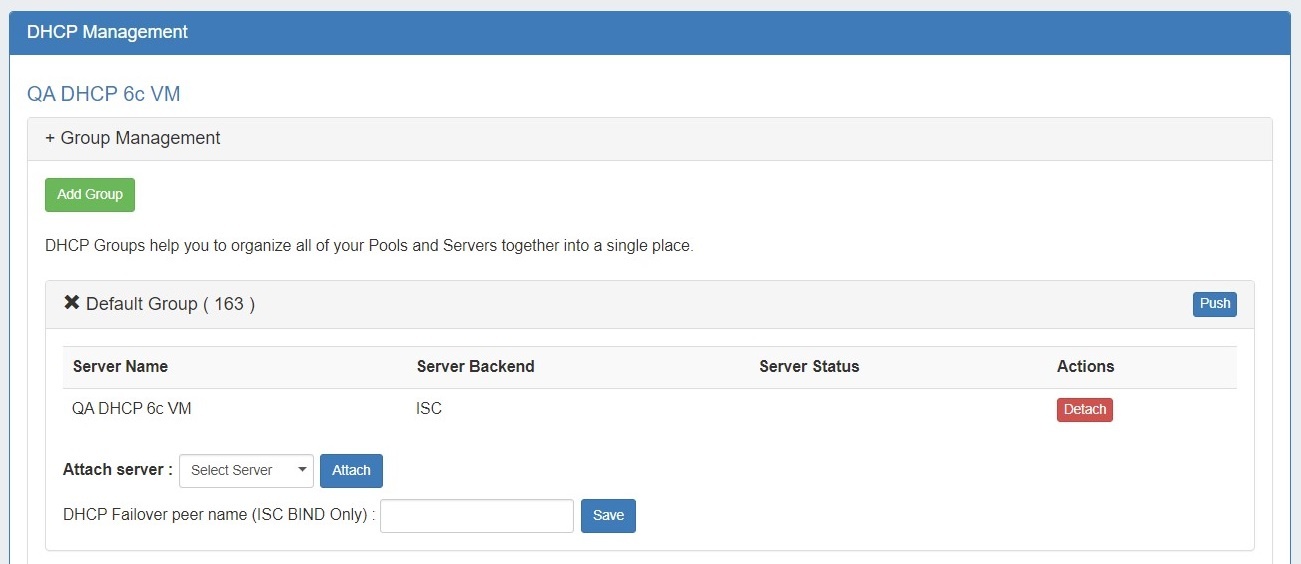If needed, a server may be removed from a DHCP group by clicking the "Detach" button.