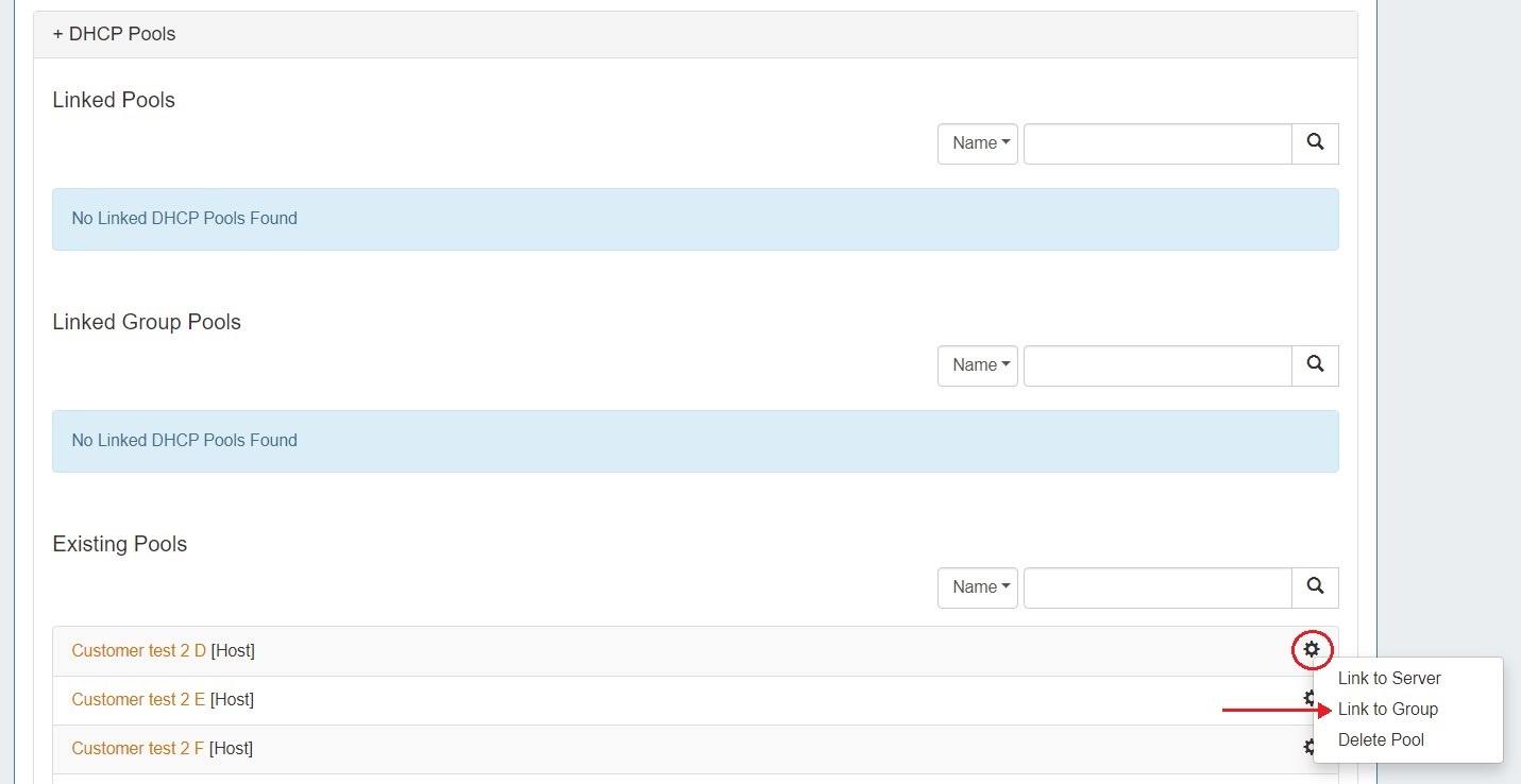 From the Existing Pools list under the DHCP Pools section, click the Action Menu (gear icon) for the pool you wish to link to a DHCP group. From there, click "Link to Group".