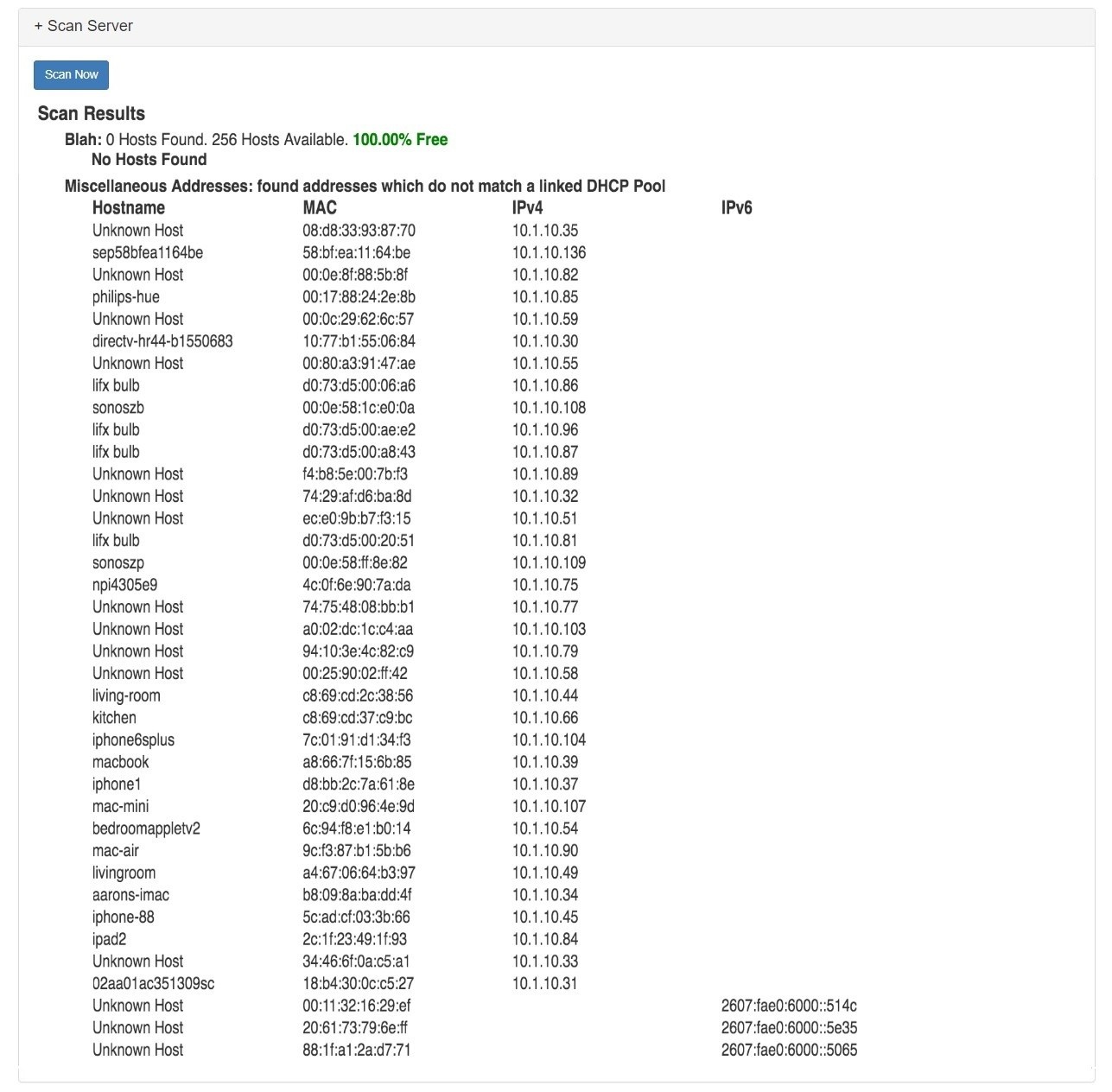 Scan Server provides a "Scan Now" button, which scans the DHCP server and returns found IPs under DHCP pools.