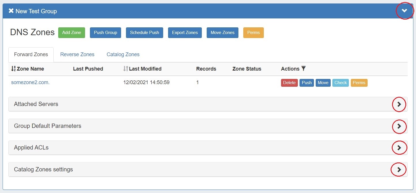 Information for Attached Servers, Group Default Parameters, Applied ACLs, and Catalog Zones settings may also be viewed and edited by clicking on the expansion arrows for each section.