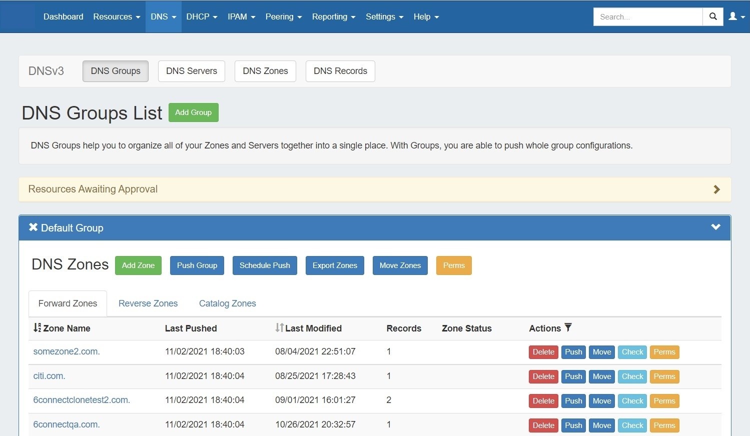 2) Resources Awaiting Approval Module - Group Level: Lists pending DNS group level approval events either submitted by, or able to be approved/rejected by, the current user.