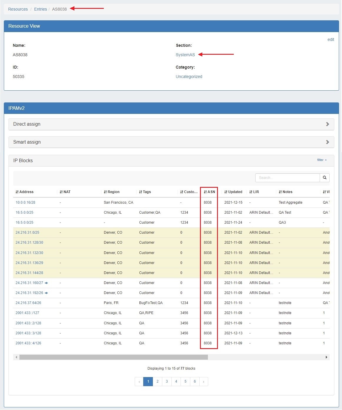 An ASN in IPAM Manage will link to the created resource, which will display all IP Blocks in ProVision with that ASN value. SystemAS resources may not be edited, however they may be deleted by an admin if desired.