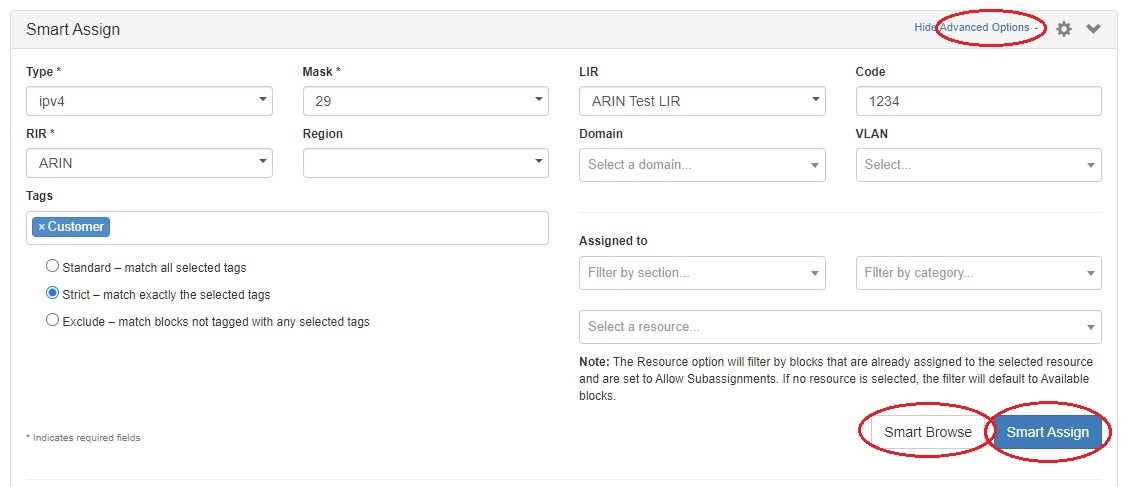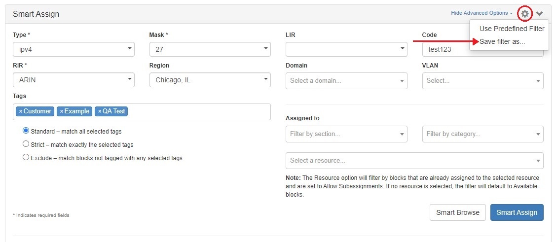 With Smart Assign, you enter criteria such as IP Type, Size, RIR, Region, and Tag information, then ProVision's automation will automatically assign a block meeting that criteria, if any exist. Smart Browse uses the same criteria, but provides a browsable list of blocks meeting that criteria for you to select from. Users can also save commonly applied Smart Assign / Smart Browse filter criteria for repeat use as Predefined Filters.