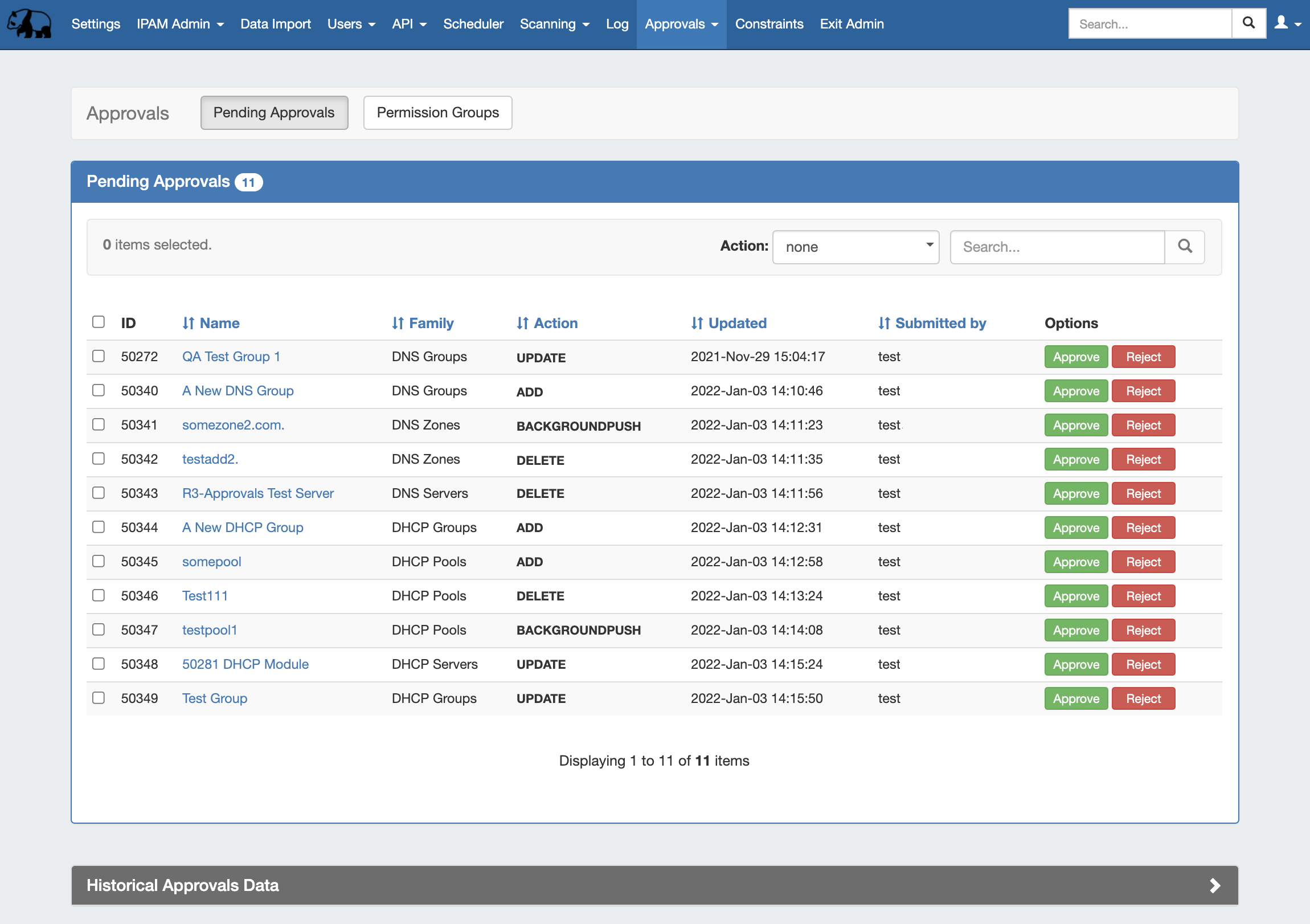 With Approvals, administrators can set group permission rules requiring that certain types of DNS / DHCP changes made by a user are either 1) automatically denied or 2) approved by an administrator. In the latter case, one or more admin group(s) must be assigned to approve those action types.