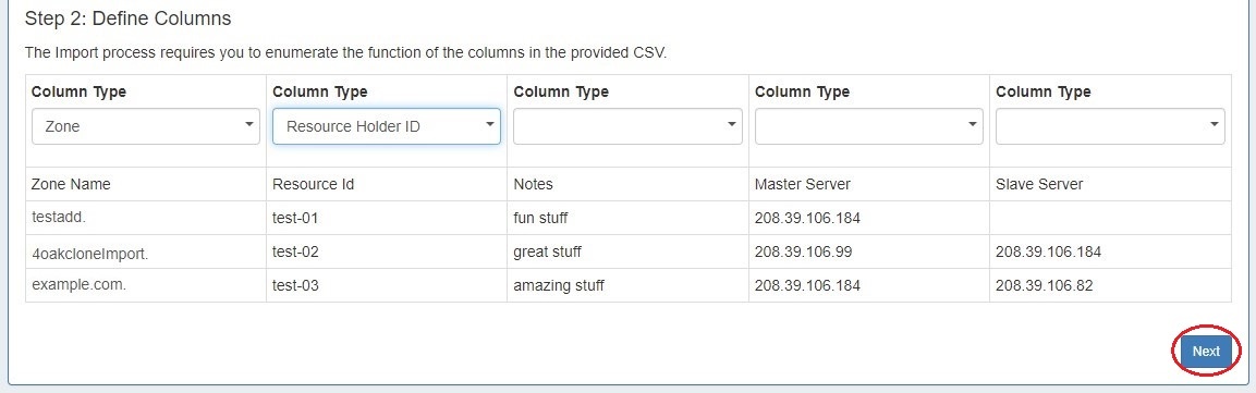 For DNS imports, two column definitions are available: Zone and Resource Holder ID. Using the dropdown menu, select the appropriate column for the zone name and Resource Holder (customer) associated with zone. The Resource Holder ID field will be used to set the Parent Resource of the individual zone once imported.