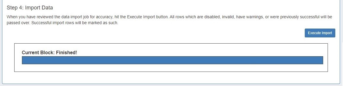When the review step is completed, hit the "Execute Import" button. A progress bar will appear to show progress and note errors if they occur.