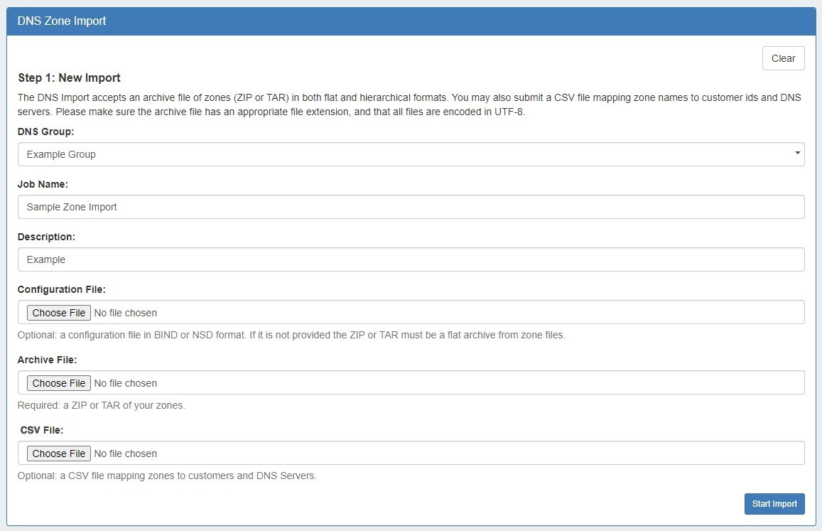 The BIND DNS Zone Upload / Import tool uses the named.conf configuration file tied to the zones you are uploading, a .zip or .tar file of the zones themselves, and an optional .csv file mapping zones to customers. The following steps are used when importing BIND DNS zones: