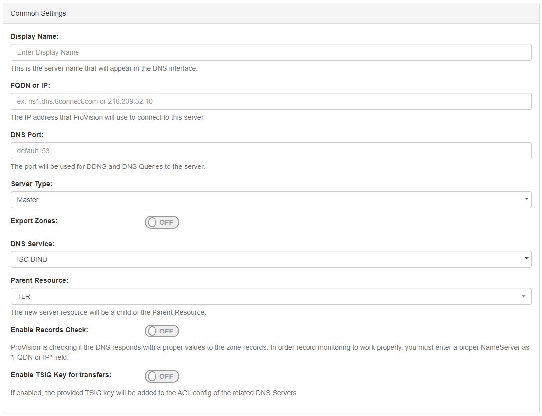 In the "Common Settings" section of Server Settings, enter the new server's Display Name (the name that will appear on the ProVision interface), the FQDN / IP, server type, service type, and desired parent Resource (may be left at the default Top Level Resource).
