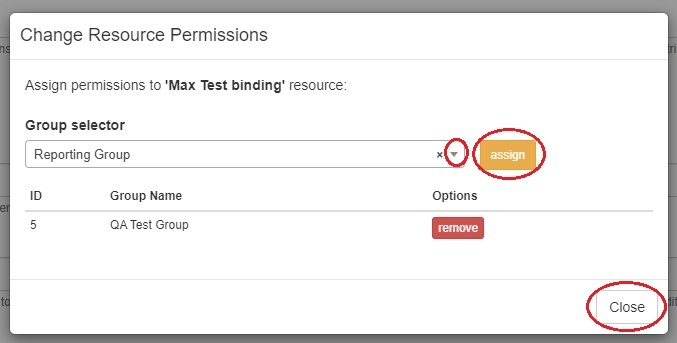Selecting "Change Binding Permissions" opens the "Change Permissions" dialog box where you can select a group(s) to assign the constraint to. The groups assigned to a constraint are listed below the group selector.