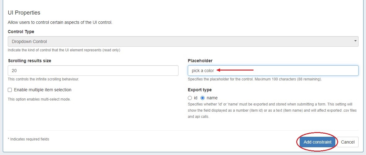 In the "UI Properties" section, you may enter custom placeholder text or enable multiple item selection. When done, click "Add Constraint".