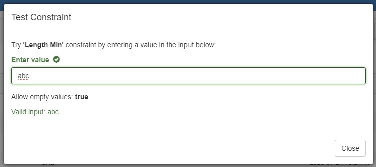 The test constraint form will appear - enter a test value, and you can check whether the constraint returns an appropriate invalid or valid response: