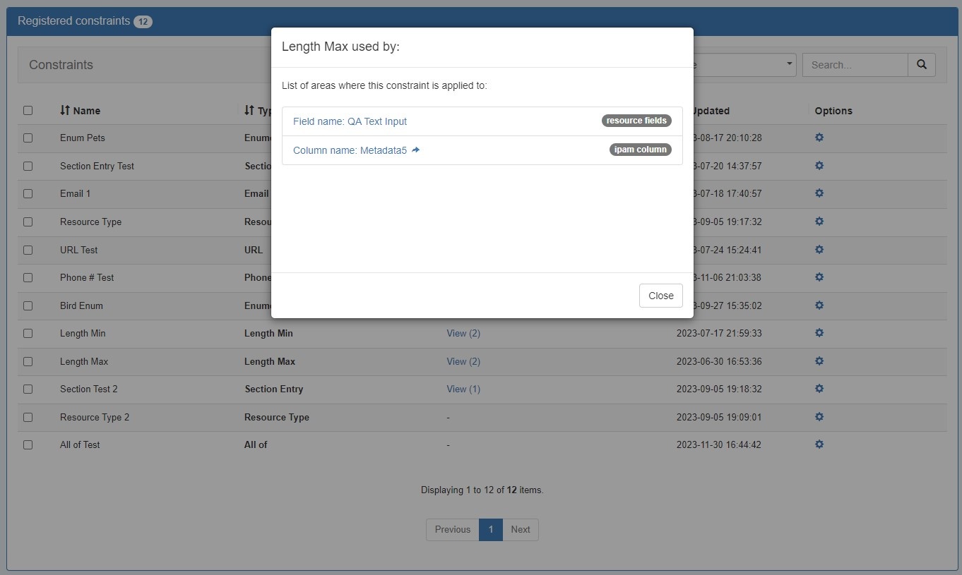 The "Used by" column allows users to view which resource views and/or IPAM attributes have a specific constraint applied. Simply click the constraint's "View" link in the "Used by" column and a modal will open.