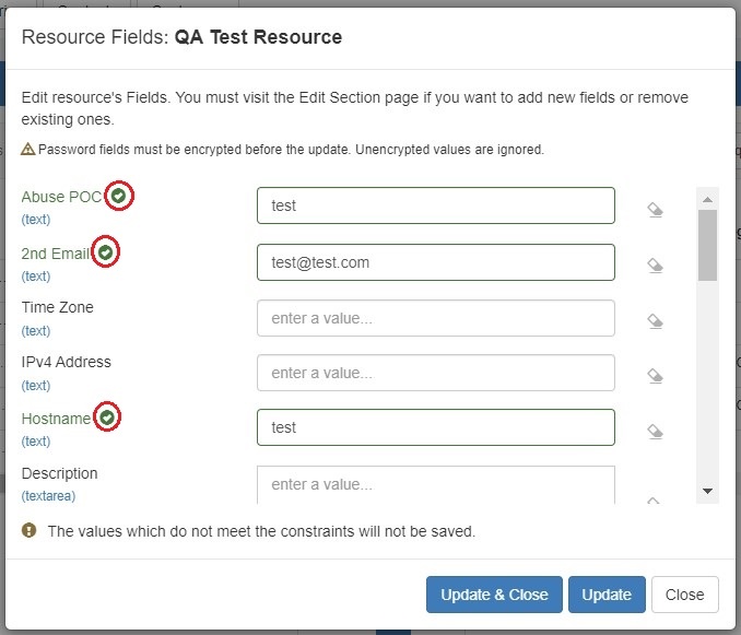 The Constraints Tab, available to Admin users, allows for custom field validation and field restrictions to be created for Resource and IPAM fields. Constraints are applied to Resource fields from the Edit Section page and to IPAM fields from the Admin Edit IPAM Columns page. The applied constraint may be anything from a numerical comparison operation,  a check against a pre-determined text string, ensuring selections from a pre-set list, or forcing entries into a specific format, such as IPv4/IPv6, phone number, or RegEx.