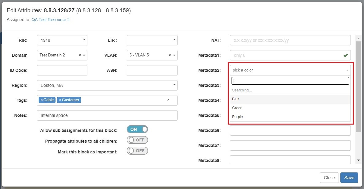 To see the constraint in action in IPAM or Resources, navigate to a block or field and open Edit. Select the field to which you applied the enumeration to view/select constraint items from the dropdown