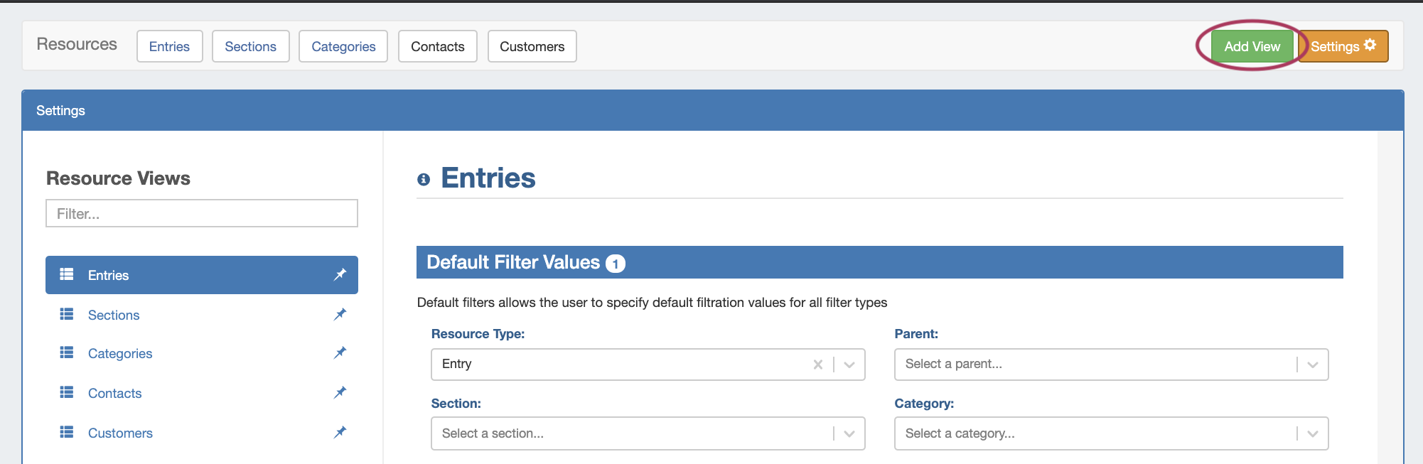Five resource view lists are provided by default, including "Entries", "Sections", "Categories", "Contacts", and "Customers", and users may either edit the provided views or create additional custom views from variety of filter and attribute column options.
