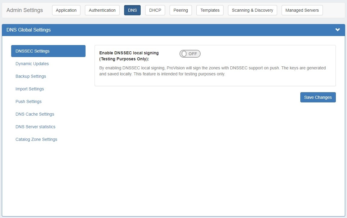 DNS Settings are accessed by clicking the "DNS" sub-tab at the top of the Admin Settings page. DNS Settings are used to support various DNS functions, including DNSSEC, Dynamic updates, backup settings, push settings, DNS cache settings, and DNS server statistics.