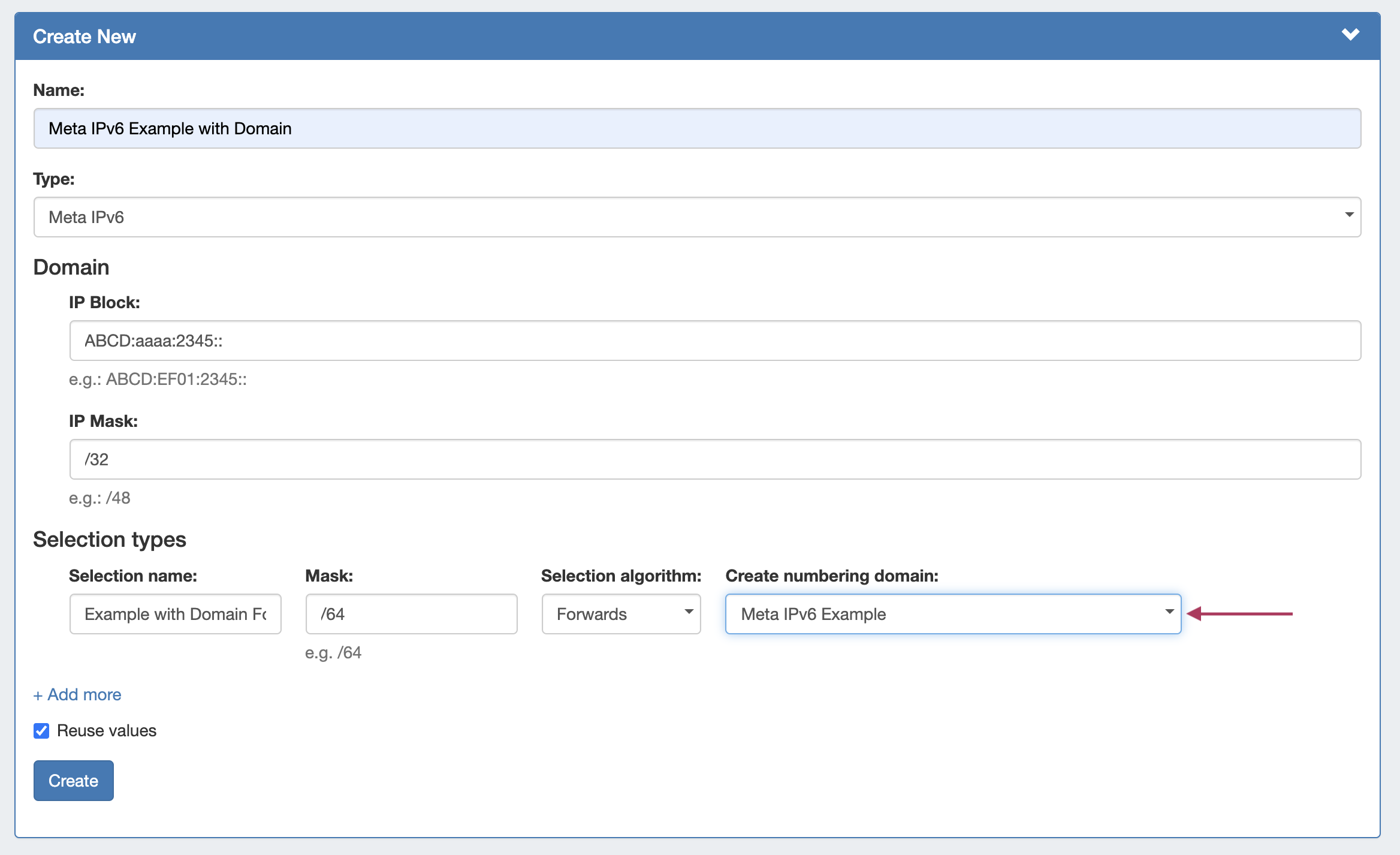 • Here, we've created a new Meta IPv6 Numbering Authority "Meta IPv6 Example with Domain", where the selection creates a new domain based off "Meta IPv6 Example".