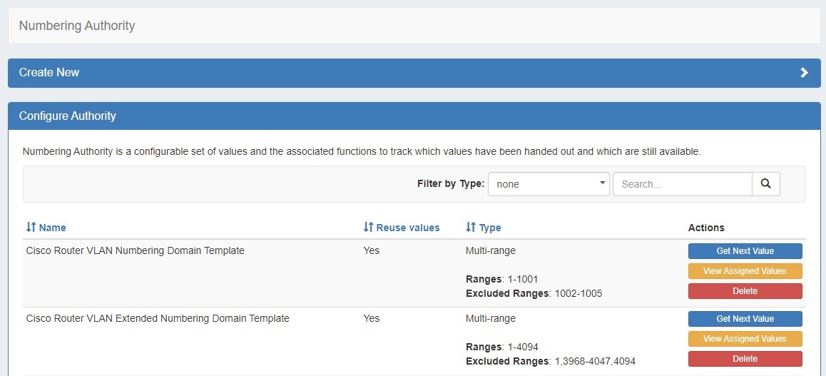 Six numbering domain types are available in Numbering Authority: Sequential, Multi-Range, Meta Multi-range, UIUDv4, IPv6 Sparse Allocation, and Meta IPv6.