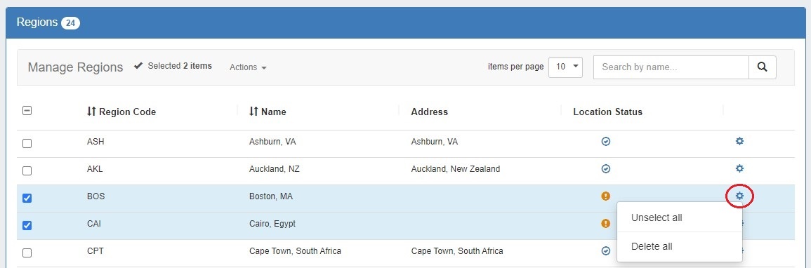 To delete multiple regions, select the regions to delete by clicking the checkboxes at left. Then, click on the "Actions" menu at the top of the list and select "Delete All".