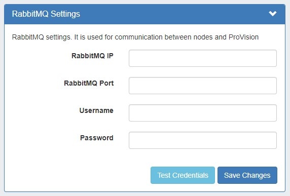 Enter the RabbitMQ IP, port, username, and password into the RabbitMQ Settings section. To verify the settings, click "Test Credentials".