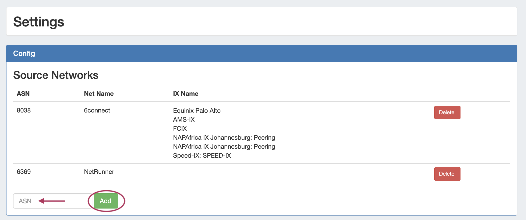 Under the "Config" section, you'll see a field to add an ASN - fill in the desired ASN(s), and click "Add".