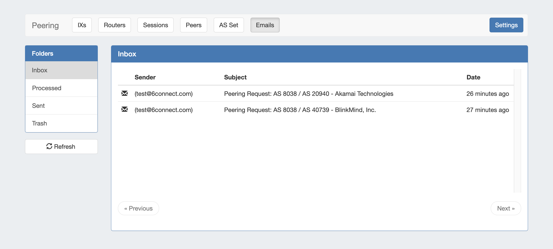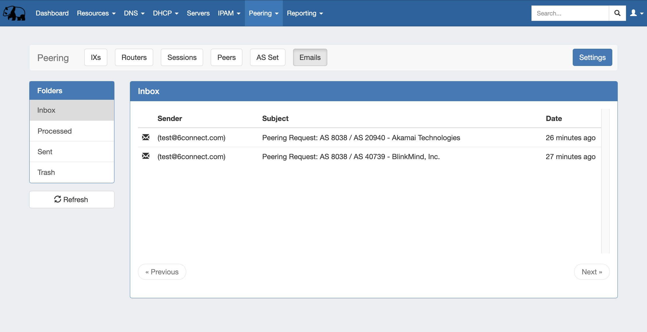 The Peering Emails subtab associates a single company peering email account (such as peering@company.com) with your ProVision instance, creating a 'shortcut' email system to keep on top of the most recent peering requests while in ProVision.
