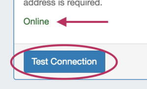 When done, you can verify the information is correct by clicking "Test Connection" - if the account is valid and a connection succeeds, you will see a "Online" response.