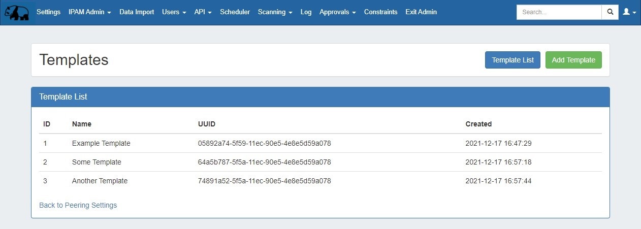 Peering Templates are accessible to Admin users from the Admin Settings → Peering page, under Peering Settings.