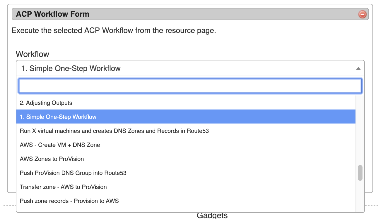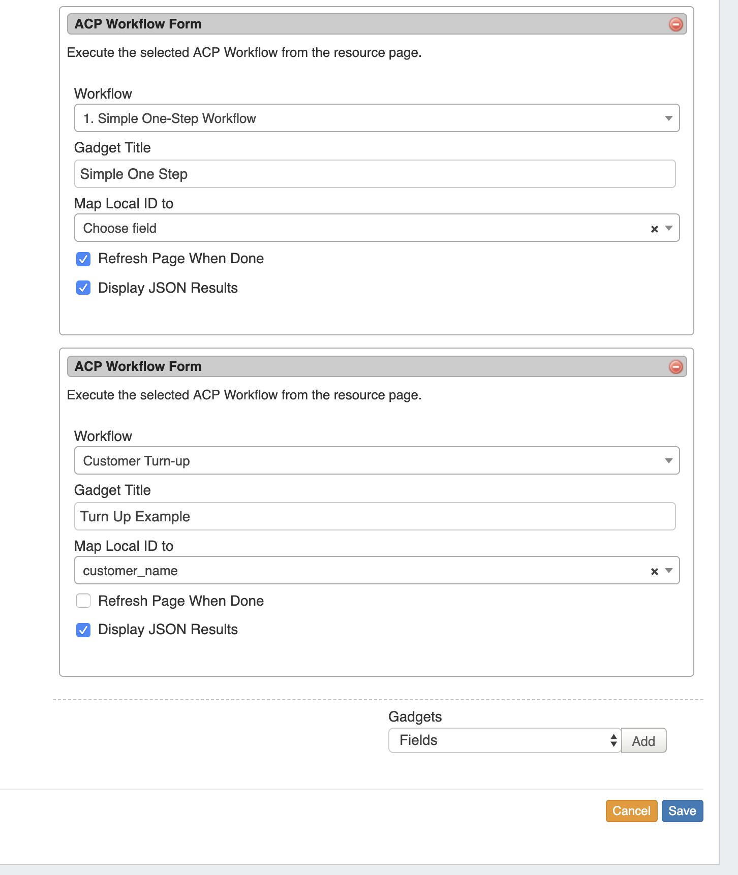 After setup, the ACP Workflows Gadget will load with the available Workflows from your ACP instance, and can be configured to select which Workflow and inputs you wish to use.