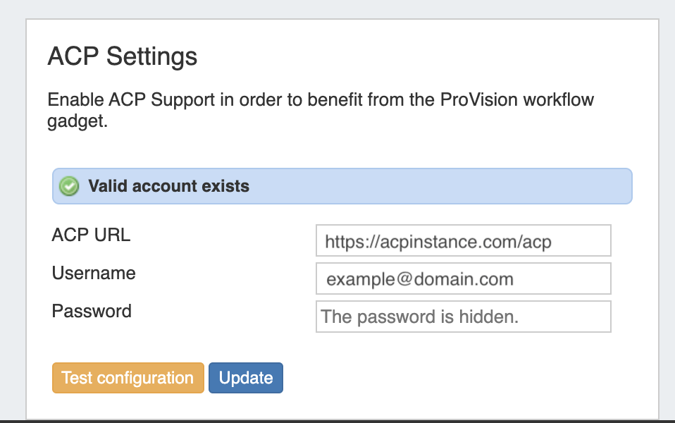 Enter the ACP URL for a licensed ACP instance, then provide the ACP Username and Password for the user that should be used to execute Workflows. To verify the account, click "Test Configuration" - you will be notified whether the account is valid.