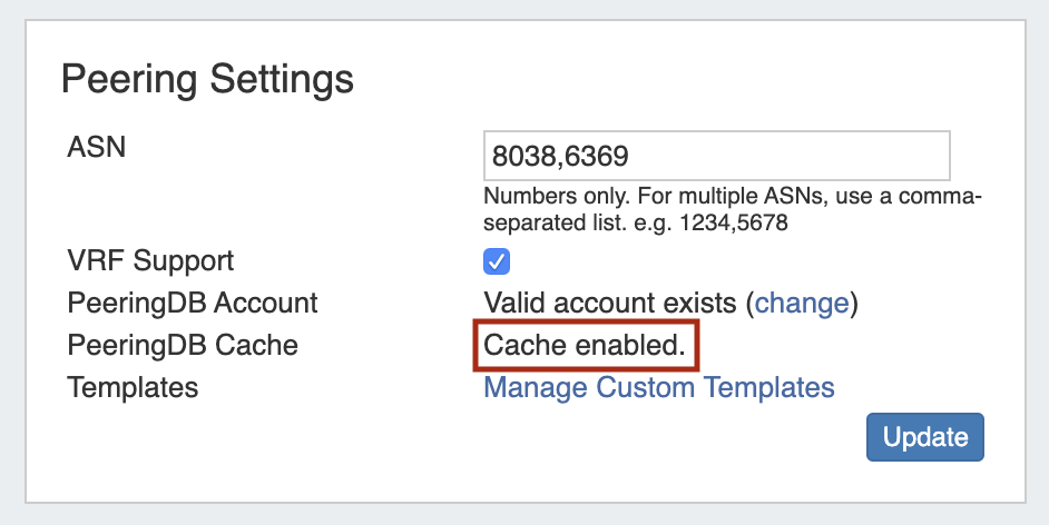 Peering Settings now displays a status notification to show whether Peering DB cache is enabled or disabled.