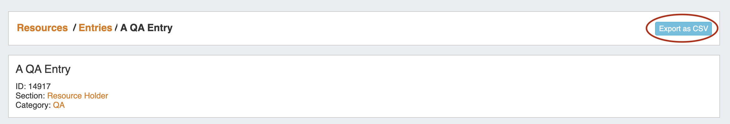 To export the Resource, click the "Export as CSV" button in the header on the Resource Entry Page.