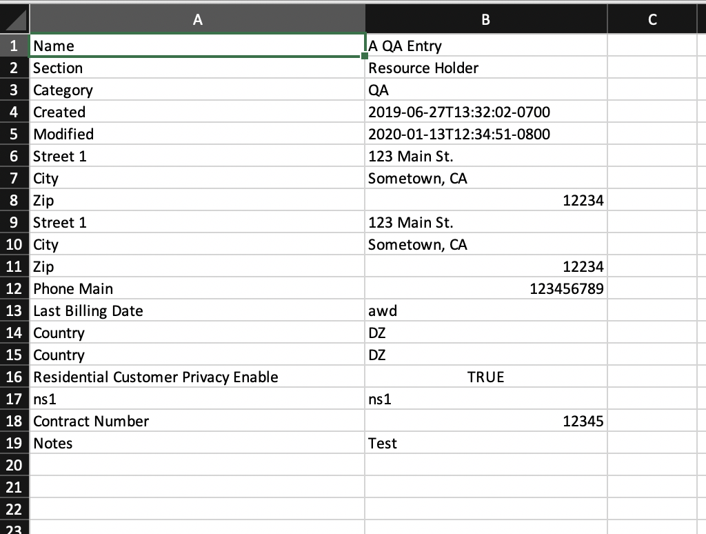 The downloaded .csv file will contain the fields containing values from the Resource Info, Contact Info, Tech Info, and Resource Field Gadget(s), with the field name in the first column, and the field values in the second column.