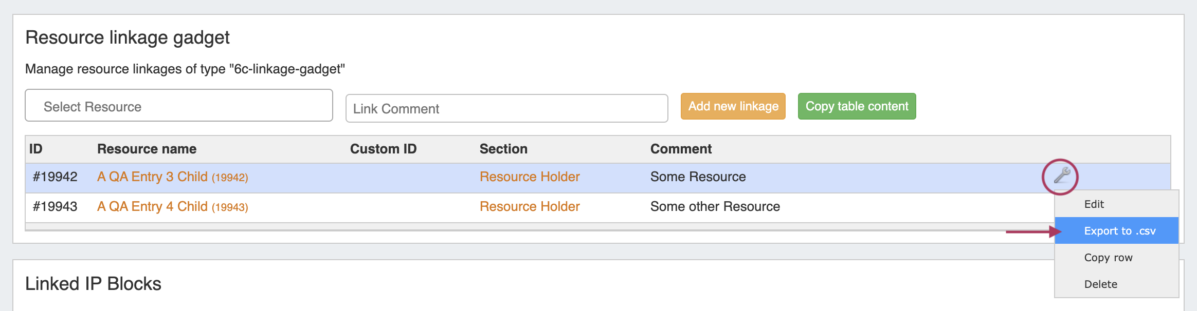 To export .csv information for the linked resource in the Resource Linkage Gadget, click on the wrench icon for the linked resource, then select "Export to .csv". The file will download from your browser.