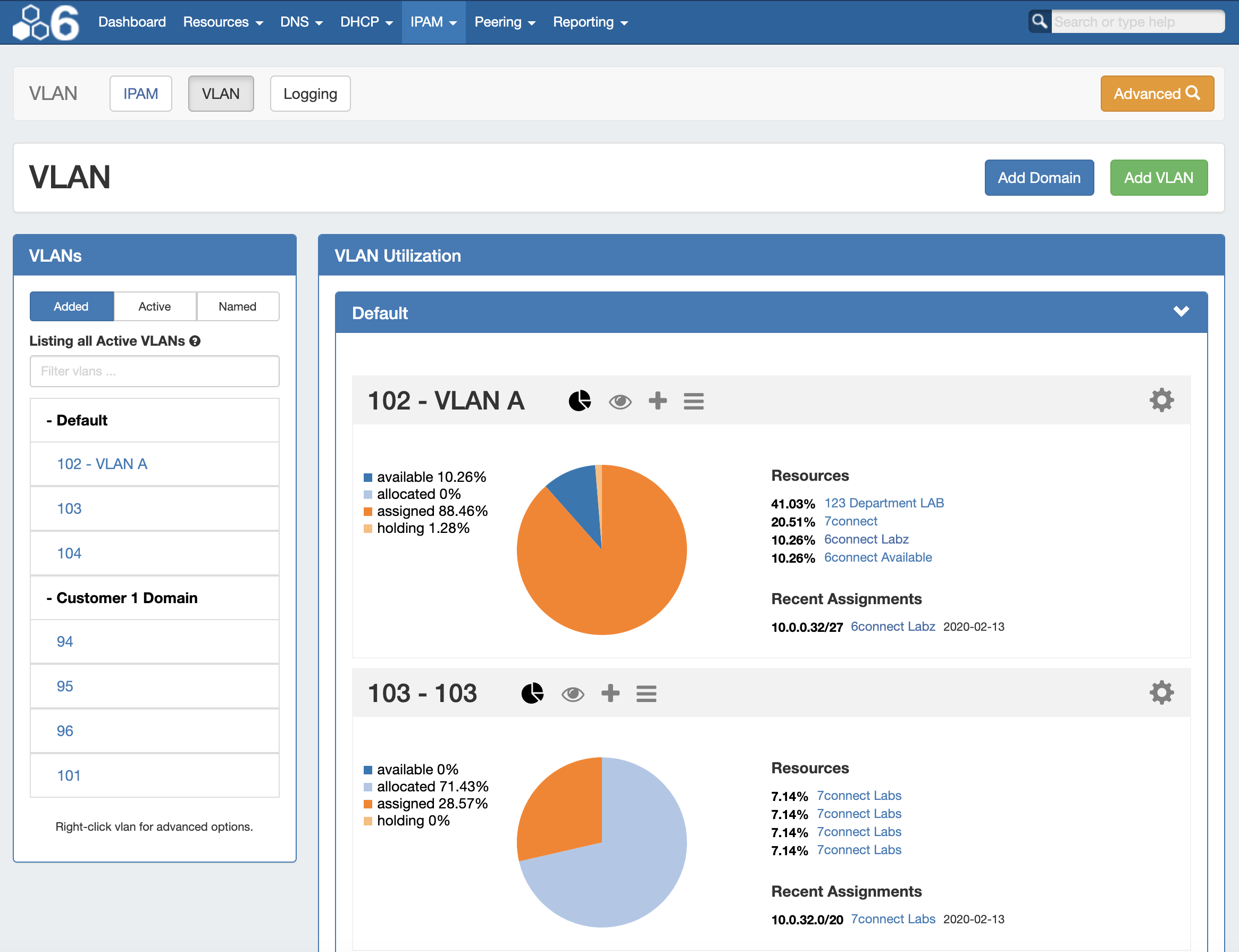 The Utilization panel displays breakdowns for all blocks assigned to the VLAN by both status (available, allocated, assigned, holding) and by resource. Recently assigned blocks are noted under the "Recent Assignments" section, and links are provided to the Resource Entry page for each resource listed. To open or close the Utilization panel, click on the "Pie" icon in the grey header bar.
