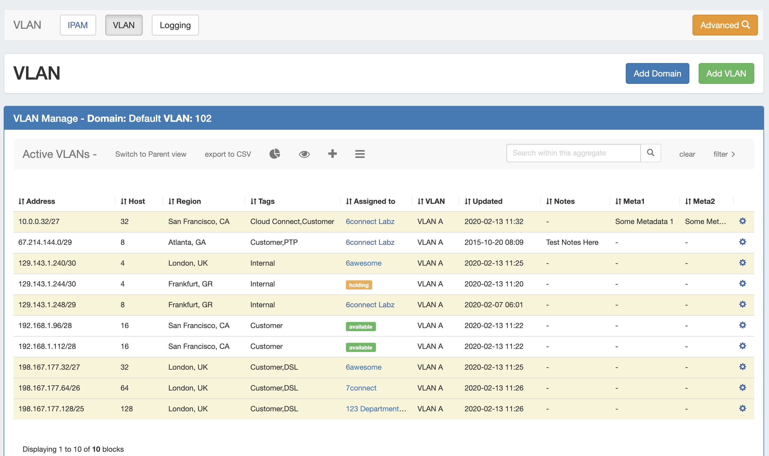 VLAN Manage has been updated to match the IPAM Manage interface and filtering options, now supports customizable columns / metadata columns, and adds access to common VLAN management areas, and includes four VLAN Panels - Utilization, Quickview, Assign Block, and Edit VLAN.