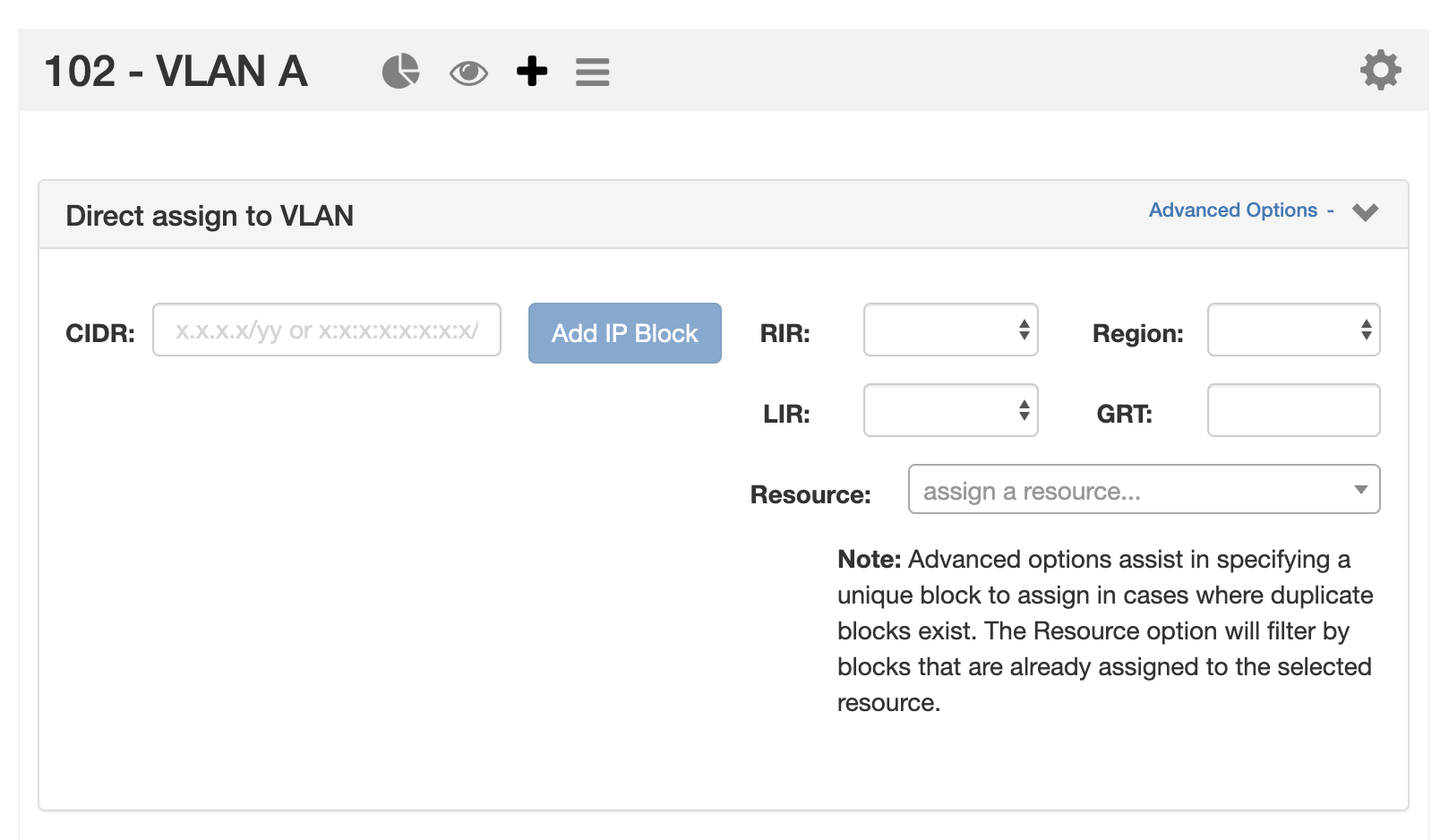 To Direct Assign a specific block to the VLAN, expand the "Direct Assign to VLAN" module, then enter the CIDR to assign into the "CIDR" box, and click "Add IP Block" .