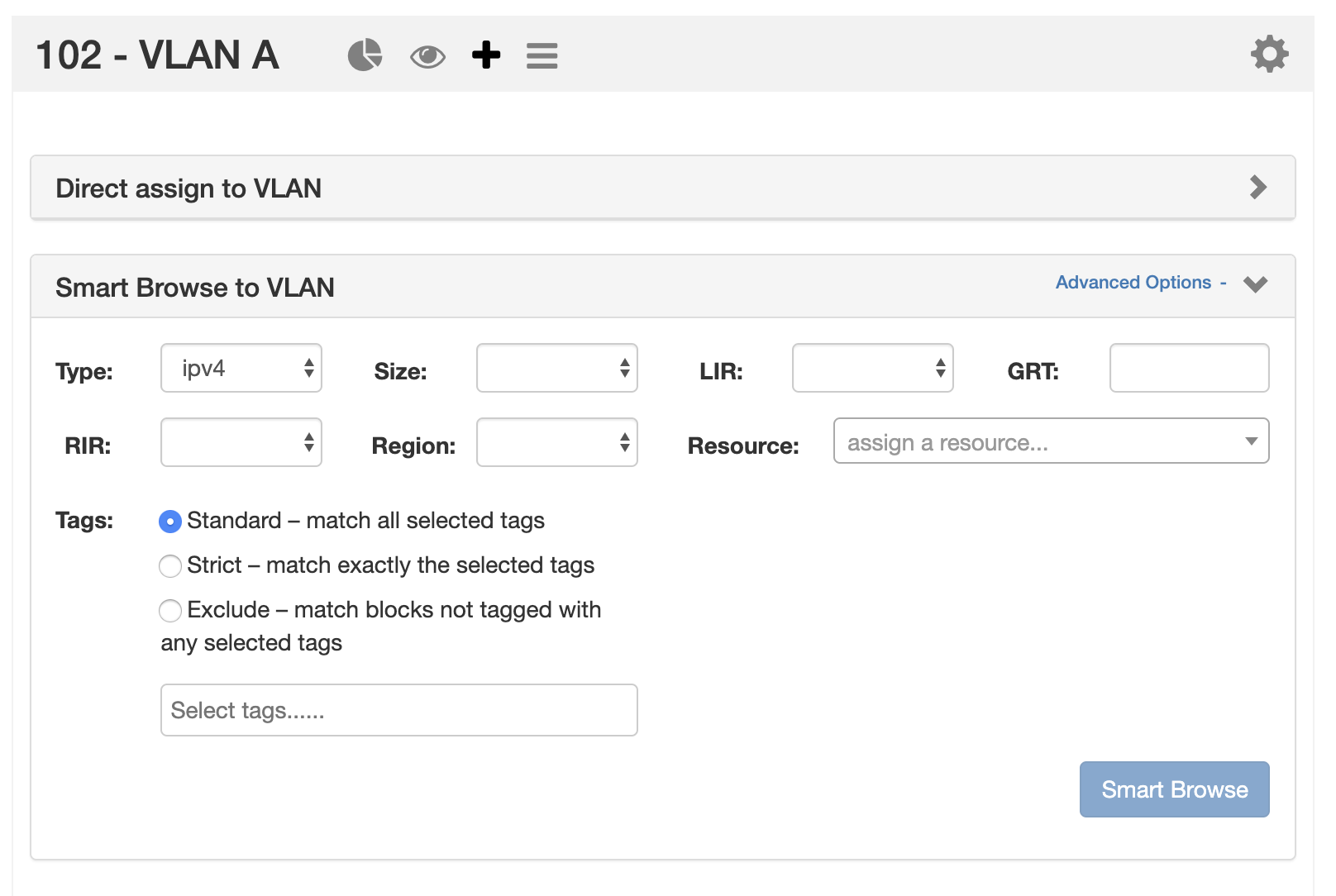Blocks may be assigned to the VLAN from the Assign Blocks Panel, opened or closed by clicking on the plus-sign icon. Two assignment options are available - Direct Assign to VLAN, if you know the specific block to assign, and Smart Browse to VLAN, where you can specify filter conditions and select one of more blocks meeting those conditions.