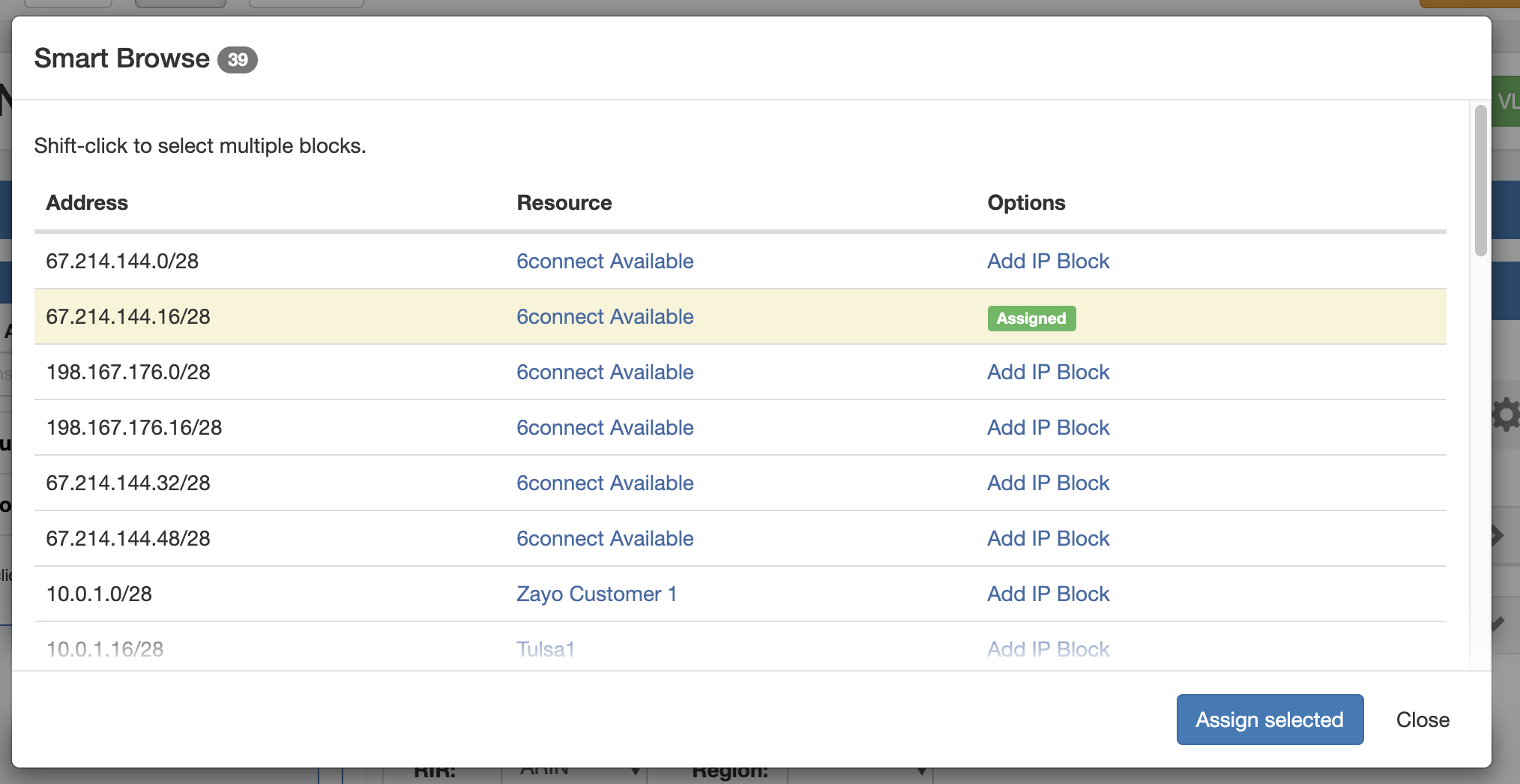 You may assign individual blocks immediately ("Add IP Block"), or select multiple blocks and delay assignment until after your final selections are complete ("Assign Selected").